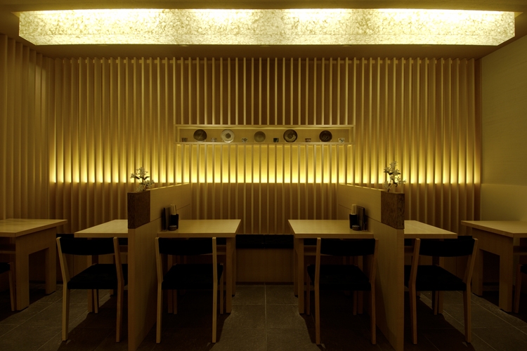木製格子やスチールグリッドの光壁。そして越前焼が彩りを添える。